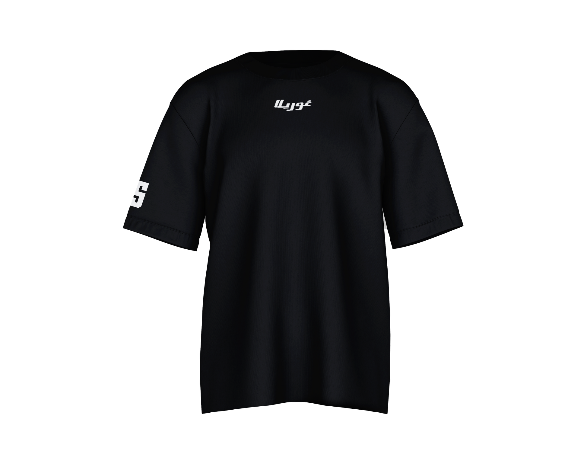 Step up your streetwear game with this premium black oversized t-shirt, designed for both comfort and style. Featuring bold white Arabic-style typography across the chest and a striking "5" graphic on the sleeve, this tee makes a statement without saying a word.